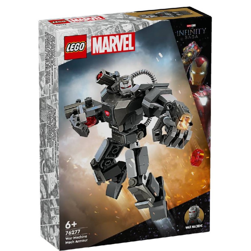 Setul de joacă construibil LEGO Marvel War Machine Mech Armor (76277) prezintă un robot construibil, complet articulat, pentru copii, băieți și fete, vine cu trăgători cu știfturi și o minifigurină pilot.