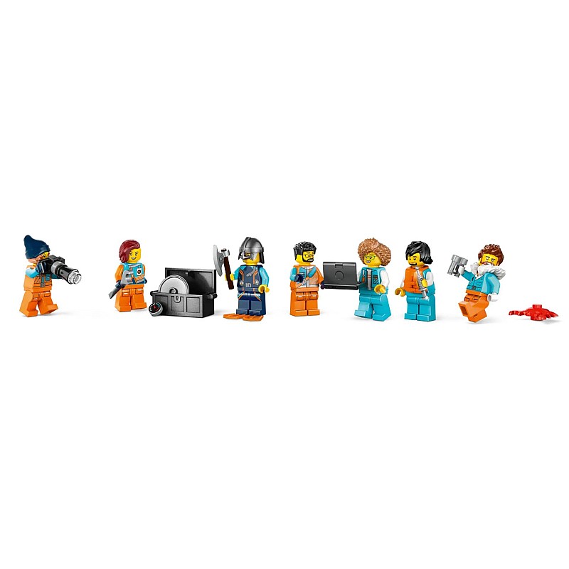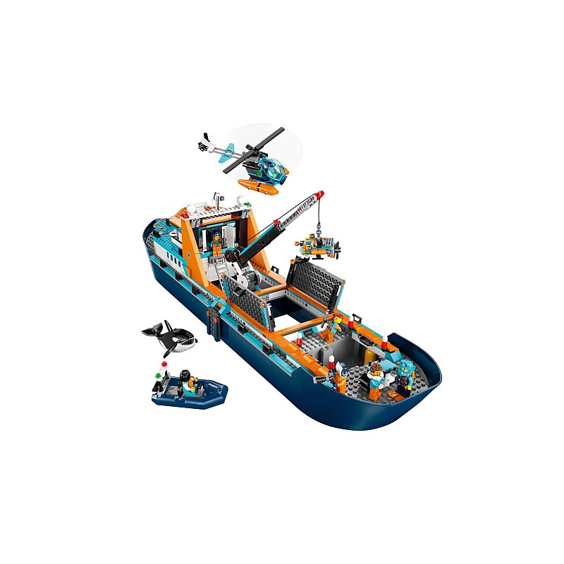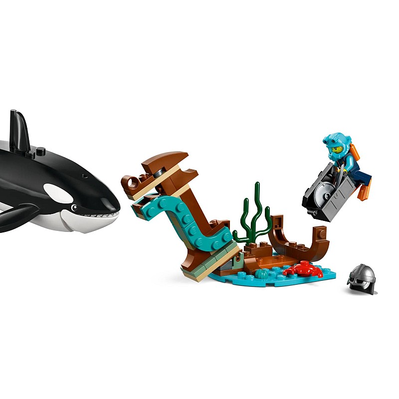 Acest set de joacă premium include, de asemenea, un elicopter, o barcă pneumatică, un submarin ROV subacvatic și o epavă vikingă, plus un cufăr cu comori, 7 minifigurine și o figurină de orcă.