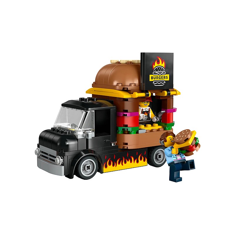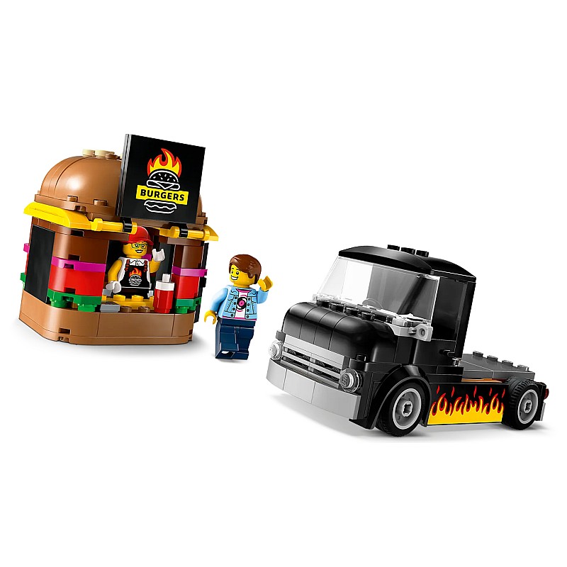 Tot ce au nevoie copiii pentru a construi un camion de burgeri o minifigurină de vânzător și o minifigurină de client cu aparat auditiv, plus accesorii LEGO pentru condimente.