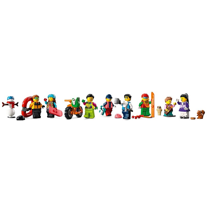 Nu trebuie decât să adaugi cele 8 minifigurine, figurinele de veveriță și bufniță și omul de zăpadă construibil pentru o distracție de iarnă fără sfârșit.