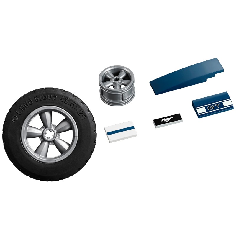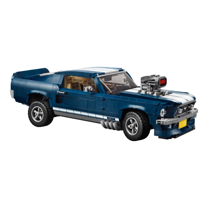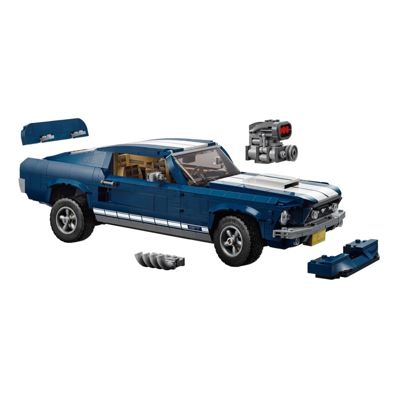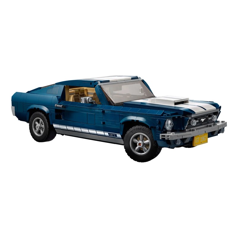 Descoperă magia unui muscle car american iconic al anilor 1960 cu LEGO 10265 Creator Ford Mustang, cu caroserie albastru închis cu dungi albe de curse, scobitură pe capotă, insignă mustang imprimată pe grilă, embleme GT și jante cu 5 spițe.