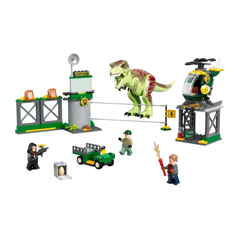 Setul include un aeroport cu un heliport, garaj, elicopter, buggy și un gard pliant, plus o figurină T. rex poziționabilă.