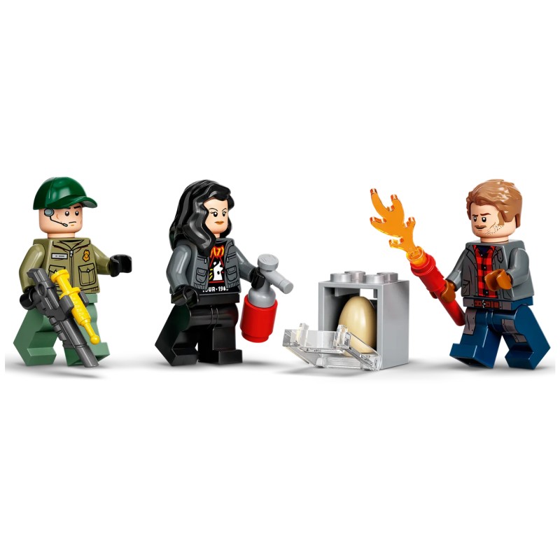 În plus, mai sunt 3 minifigurine – Owen Grady, Zia Rodriguez și un paznic al faunei sălbatice – cu accesorii precum un ou de dinozaur și walkie-talkie pentru a inspira joaca imaginativă.