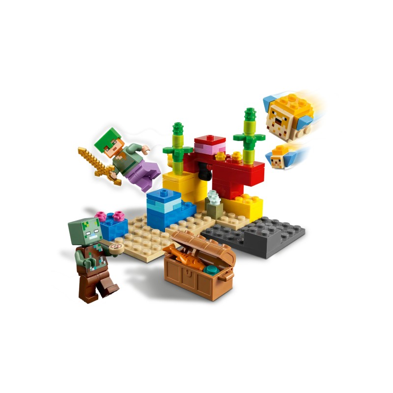 Setul este plin de elemente Minecraft pline de imaginație, de la peștișori puffer care înoată pe lângă ei până la un cufăr de comori ascuns.