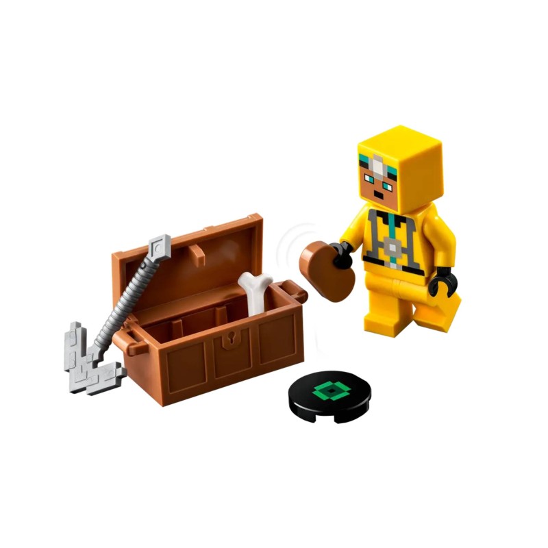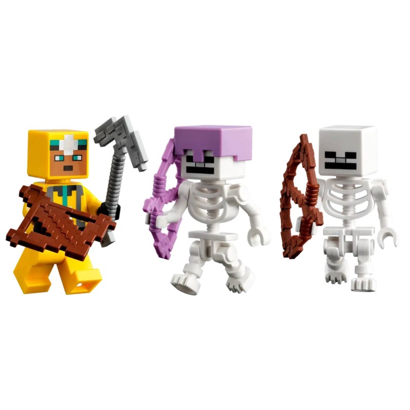 Această jucărie de construcție Minecraft include, de asemenea, un explorator al peșterii și 3 figurine de schelete, plus unelte și arme: 2 arbalete și un târnăcop.