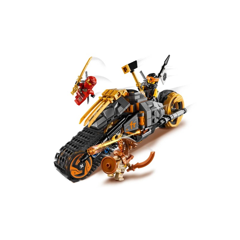 Bicicleta ninja are scaunul șoferului pentru minifigurină, trepte de omidă în față și o roată mare din spate, cu jante de culoare aurie, plus 2 lansatoare cu știfturi.