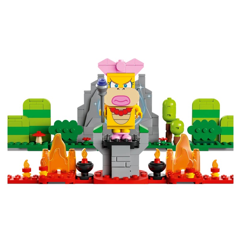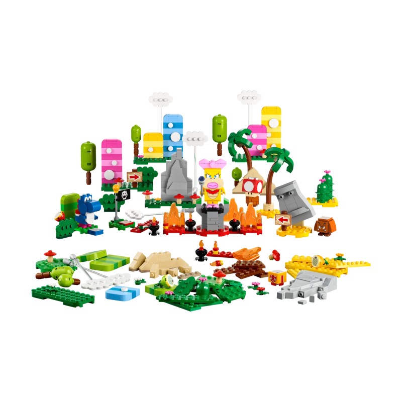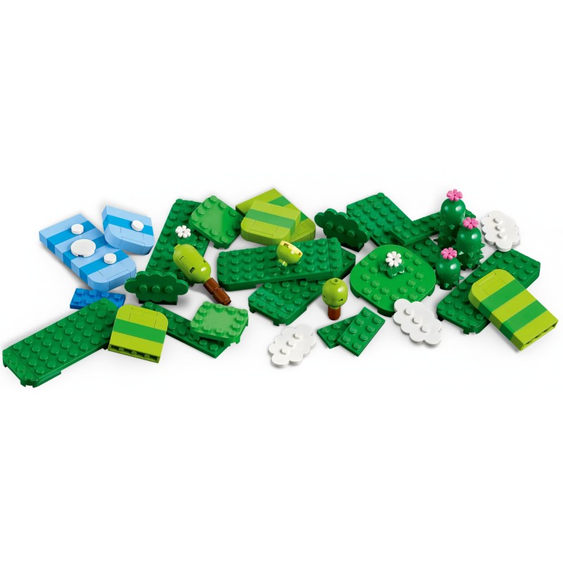 Setul include copaci, flori, dealuri, ciuperci, piramide, semne și un steag pentru punctul de control LEGO construibili, plus elemente de nor și tufiș cu aspect clasic, o cutie cadou și o Super ciupercă.