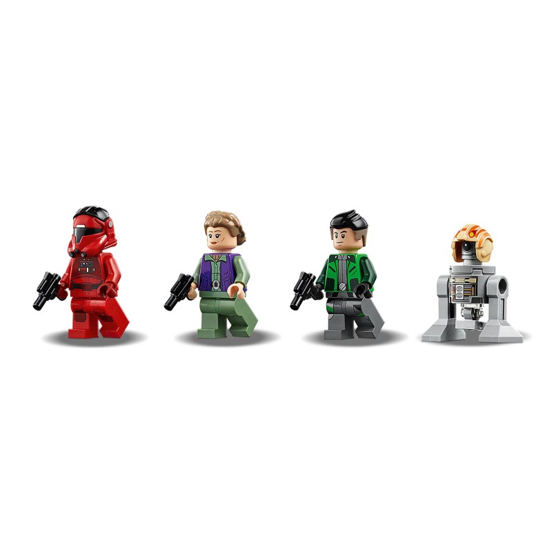 Setul include 3 minifigurine LEGO Star Wars: Major Vonreg, Kaz Xiono și General Leia, plus Bucket, 3 pistoale blaster.
