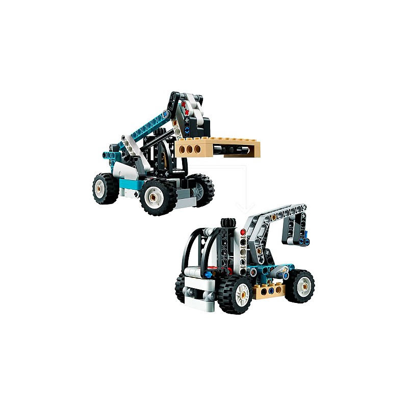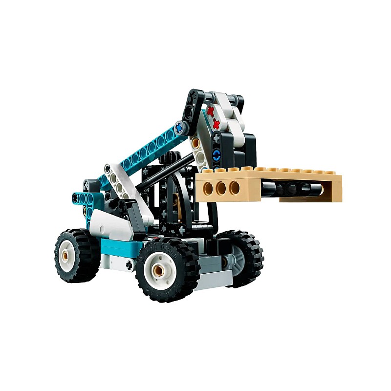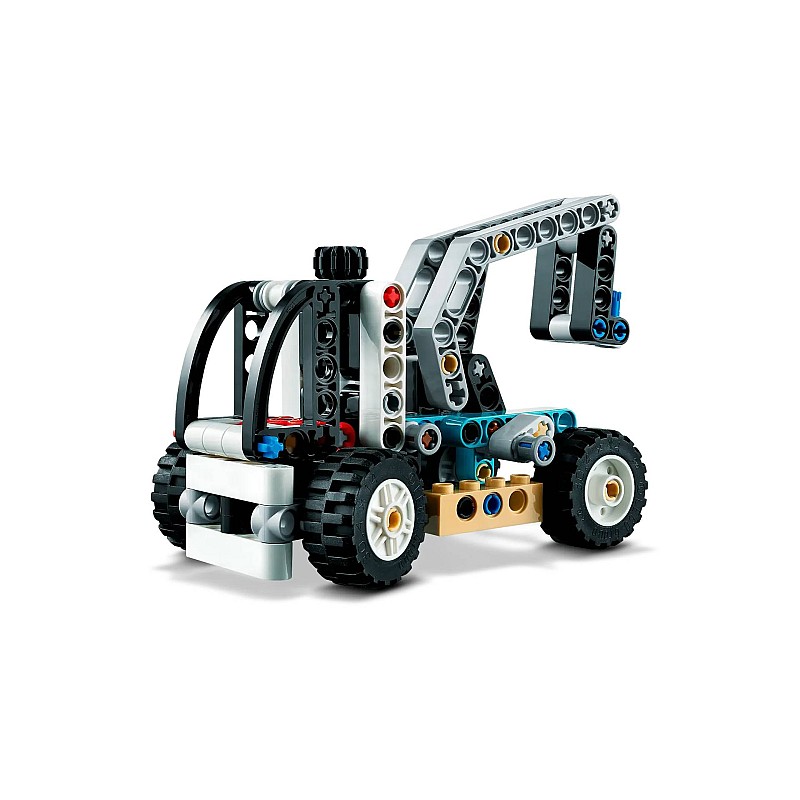 Modelul construibil LEGO Technic Telehandler vine cu caracteristici realiste, cum ar fi direcția, brațul de ridicare și furcile înclinate.