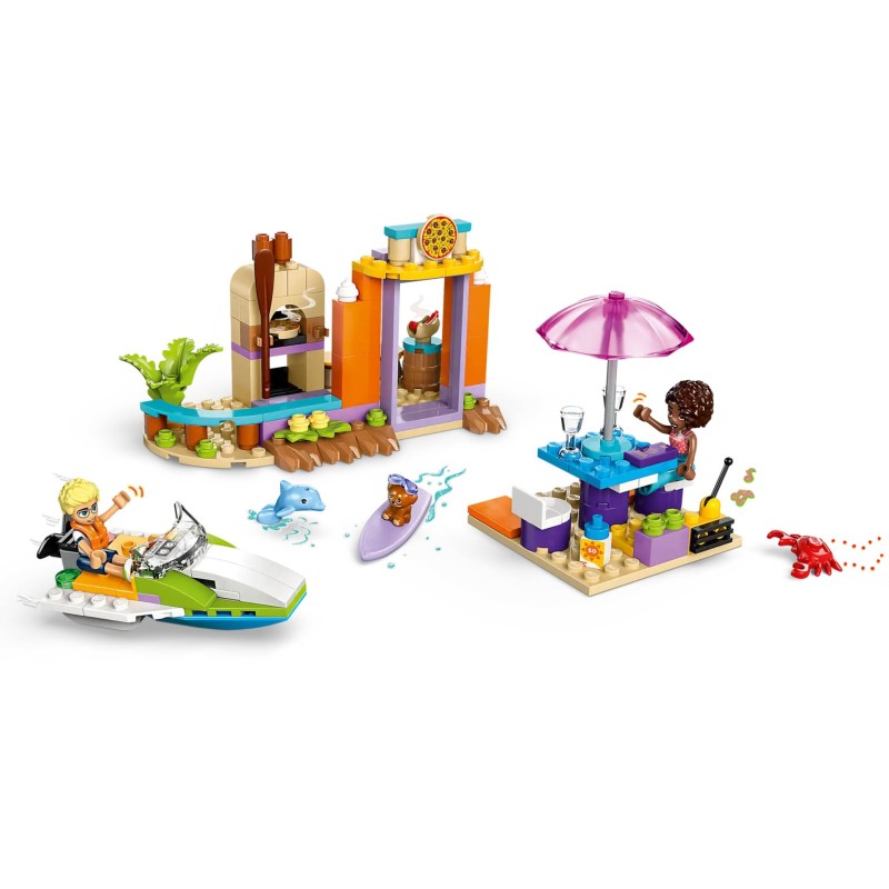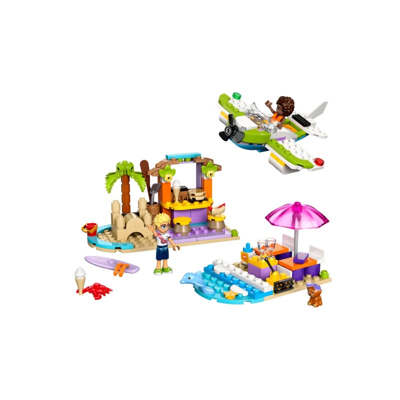 Acest set pentru jocuri de prefacere are tot ce au nevoie copiii pentru a construi un hidroavion de jucărie cu elice care se învârte, o zonă de relaxare cu o placă de surf și o cafenea de plajă cu castele de nisip, scaune și accesorii pentru înghețată.