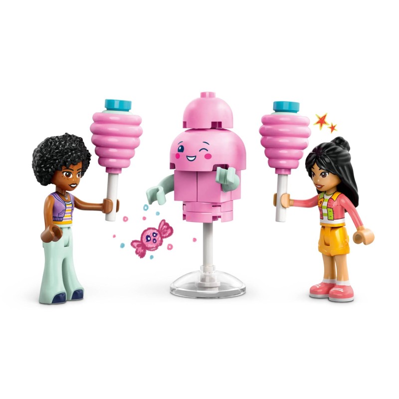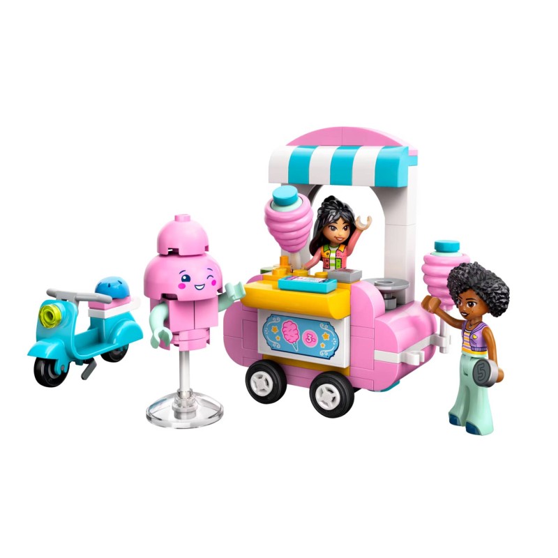 Inspiră jocul de prefăcătorie dulce ca zahărul pentru copii cu jucăria LEGO Friends Cotton Candy Stand and Scooter (42643).