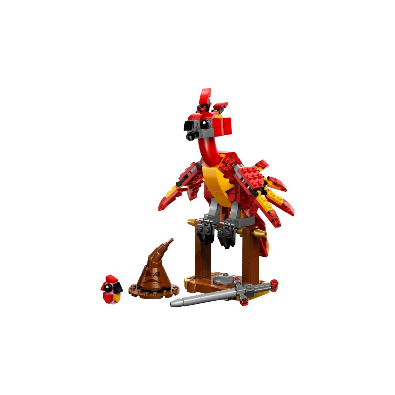 Figurina Fawkes, foarte posabilă, are gheare de prindere pentru a se agăța de cuibul său sau de Pălăria de sortare și Sabia lui Gryffindor construite din cărămidă.