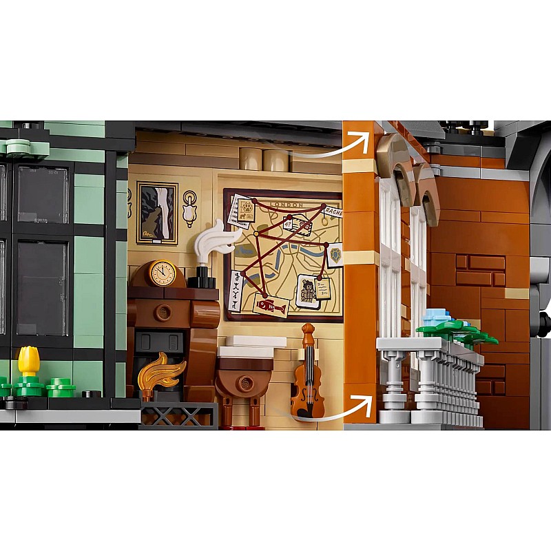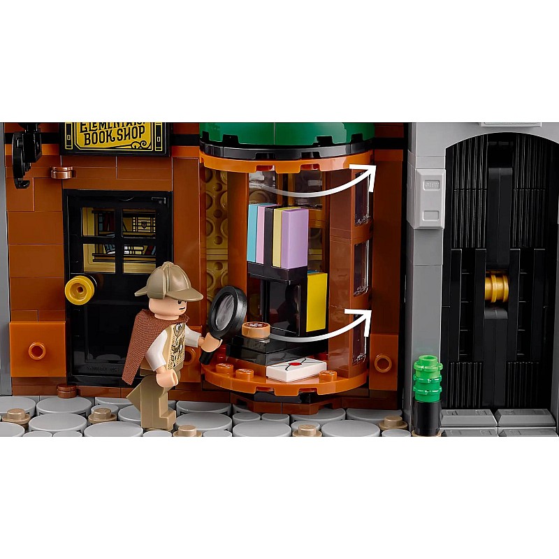 Deschide-o pentru a descoperi o librărie cu o vitrină rotativă, o reședință terasă umbroasă cu o ușă de intrare glisantă, mistere și indicii și o recreare detaliată a apartamentului 221B al lui Sherlock Holmes, complet cu un șemineu confortabil, o tablă de indicii și vioara lui iubită.