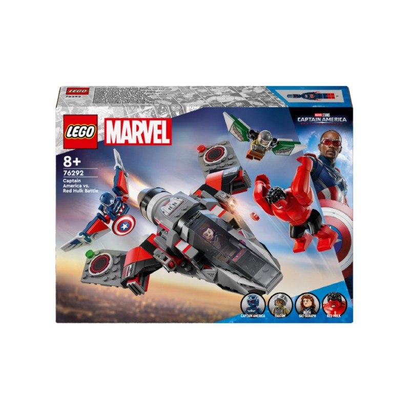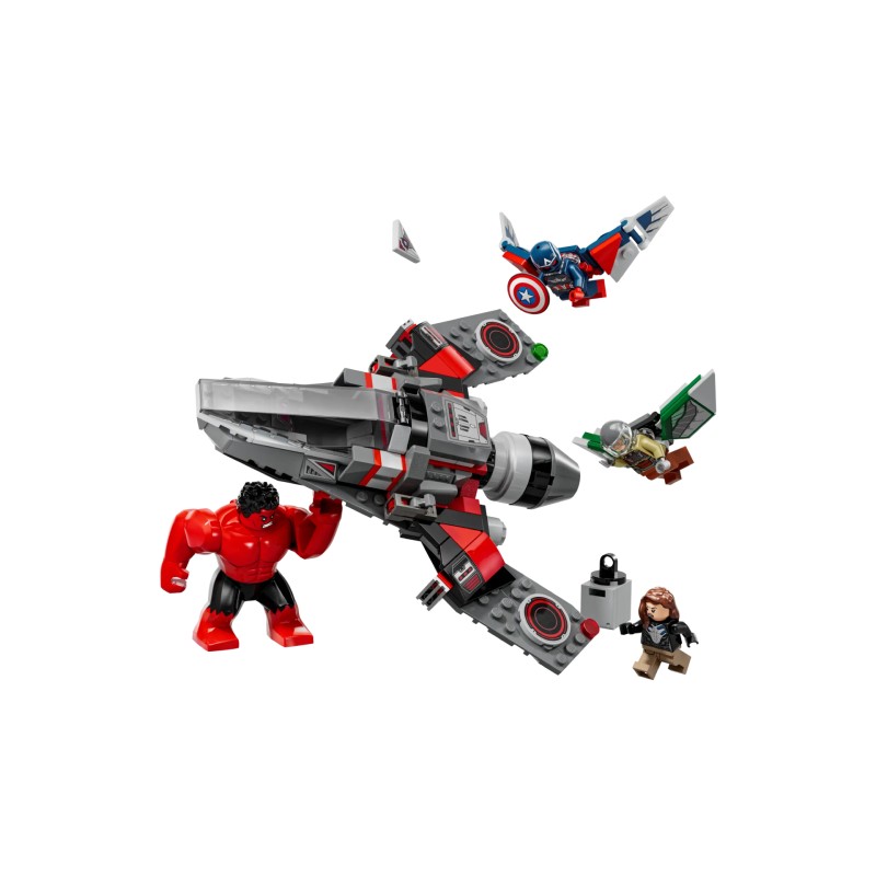 Acest avion de luptă cu reacție construibil include o selecție impresionantă de minifigurine: Căpitanul America și Falcon, Hulk roșu și Ruth Bat-Seraph.