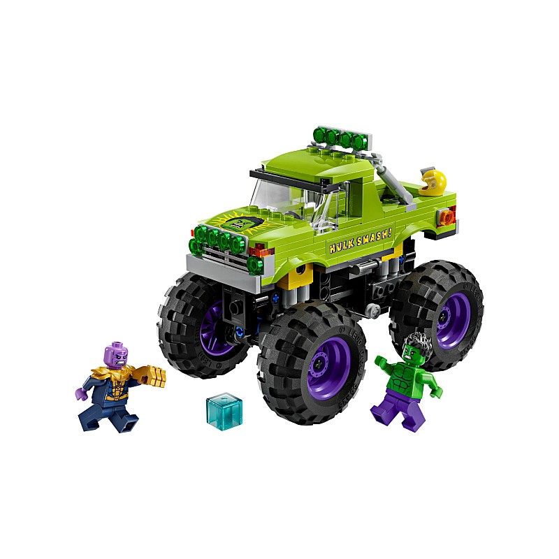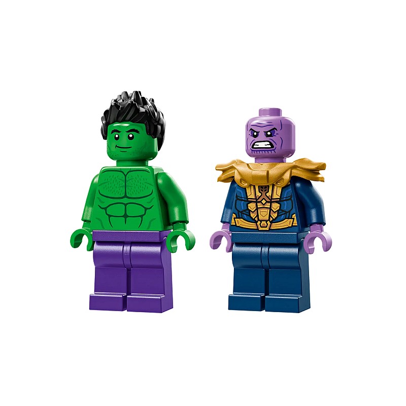 Acest camion greu LEGO Marvel construibil are o minifigurină Hulk cu o cască detașabilă și o minifigurină Thanos cu un Tesseract și o mănușă a infinitului.