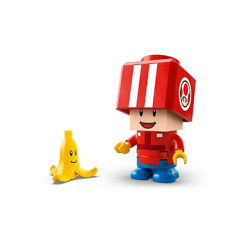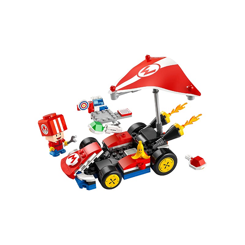O idee interesantă de cadou de ziua de naștere LEGO Super Mario pentru copii, setul include un model construibil al Kartului Standard din Mario Kart, o stație de lucru cu o țintă și o figurină de jucărie Toad (Pit Crew) în uniformă roșie de pit crew.