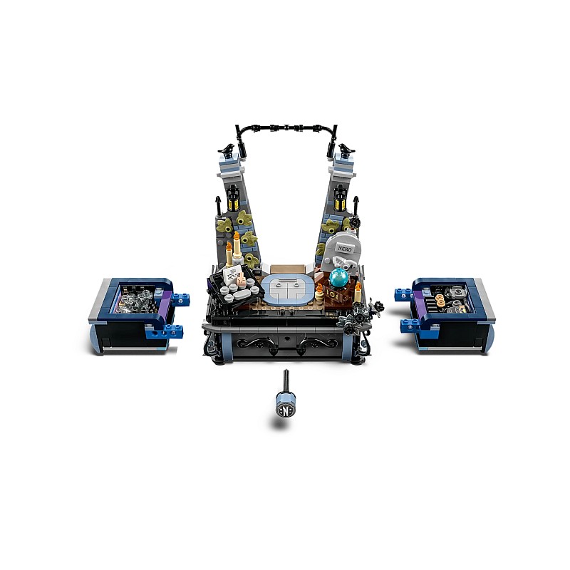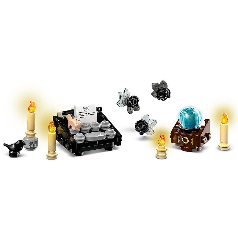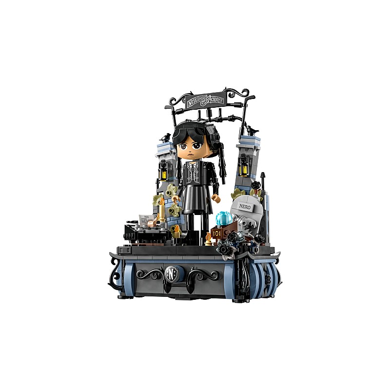 Setul include, de asemenea, poarta către Academia Nevermore și accesoriile lui Wednesday, inclusiv o mașină de scris, mormântul lui Nero, un glob de cristal și multe altele.