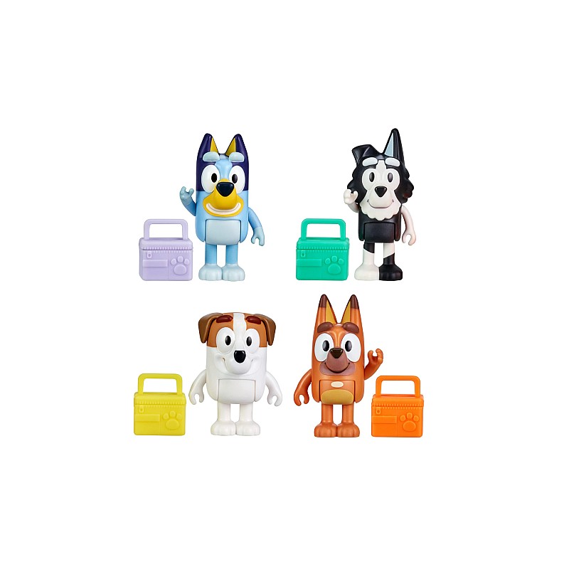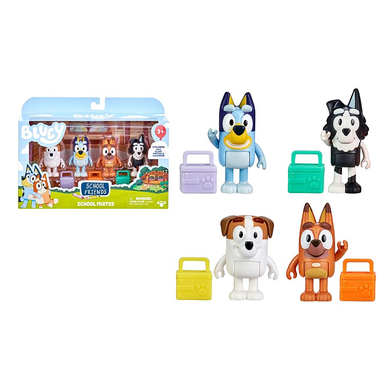 Pachetul Bluey School Mates 4 Pack include Bluey și trei dintre prietenii ei: Jack, Pretzel și Mackenzie.