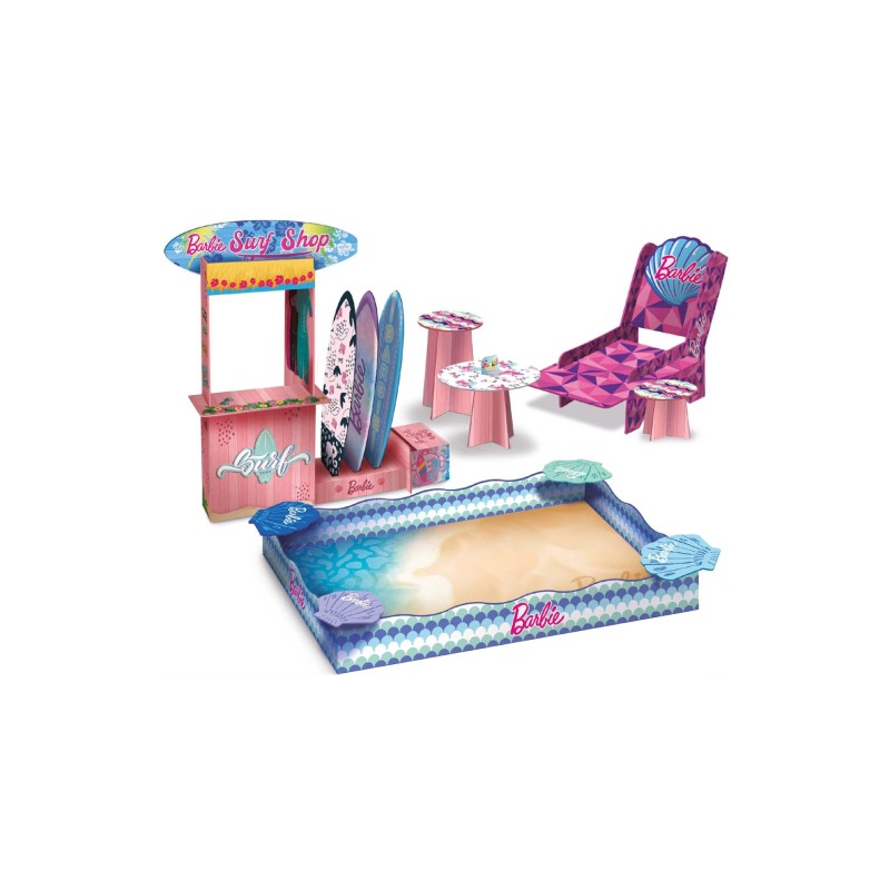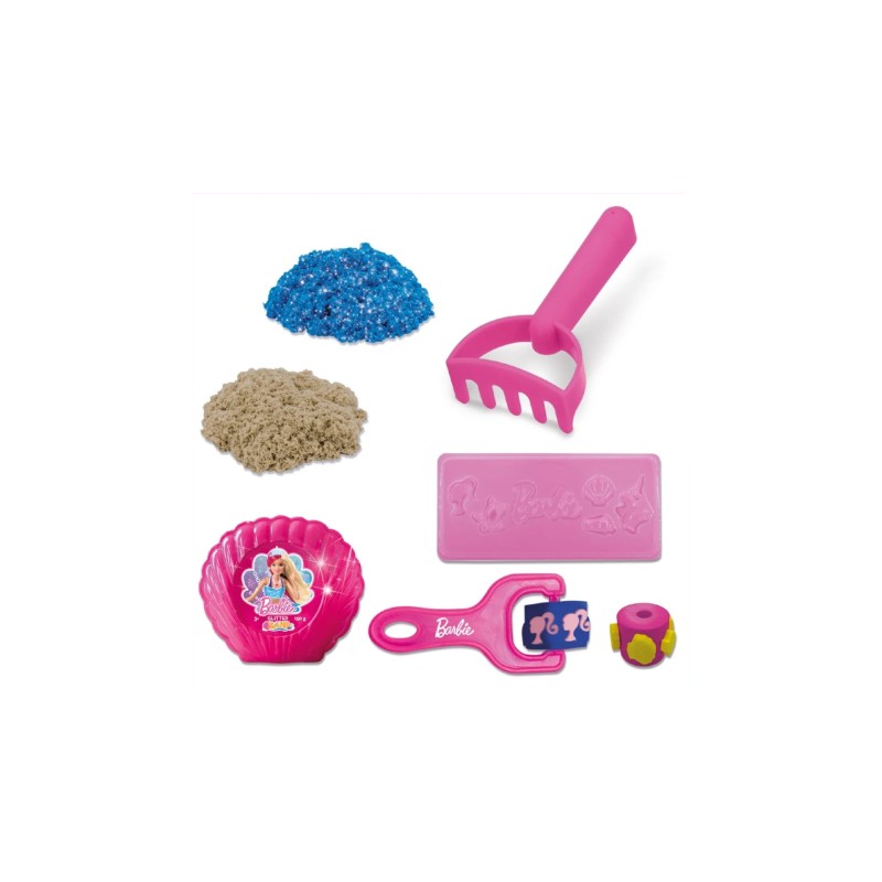 Include: păpușă Barbie, de nisip albastru strălucitor, de nisip natural colorat, cochilie Barbie, cutie de carton practică cu tematică marină, role în formă de Barbie și de cochilie , greblă de plajă.