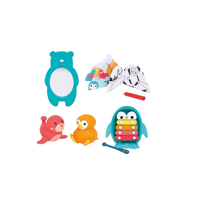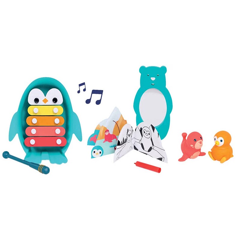 Este compus dintr-un xilofon, o carte, 2 stropitori si o oglinda de baie.