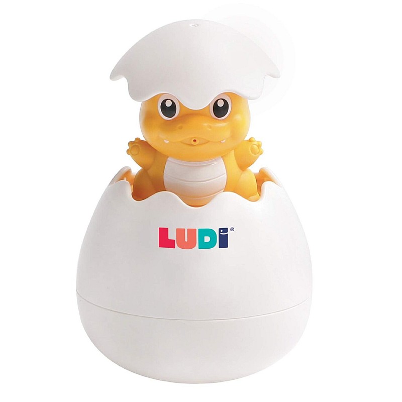 Dinozaurul își scoate timid capul din cochilie sub apă și, ca o surpriză pentru copil, plouă ca un duș sub ou atunci când iese din apă.