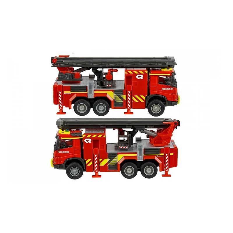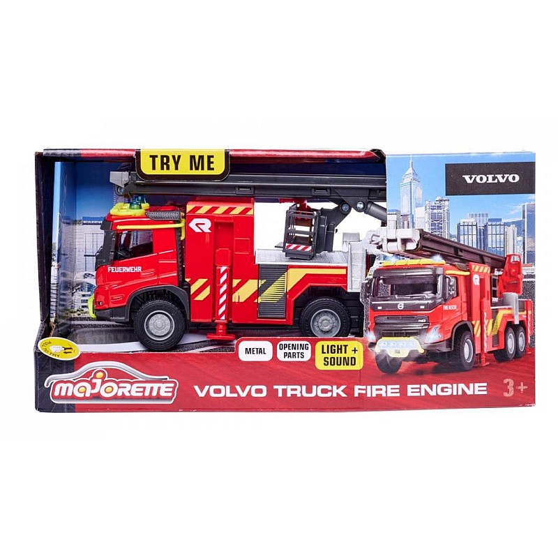 Majorette - Mașina de pompieri Volvo este un model premium de vehicul cu scară rabatabilă și anvelope de cauciuc, mașină de pompieri de jucărie cu efecte luminoase și sonore.