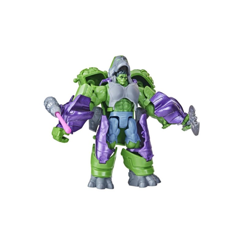 Această figurină de acțiune Hulk cu Gamma Blaster Mechasaur are membre care pot fi puse în poziție și o figurină Mech pe care copiii o pot demonta pentru a forma un costum Mech.