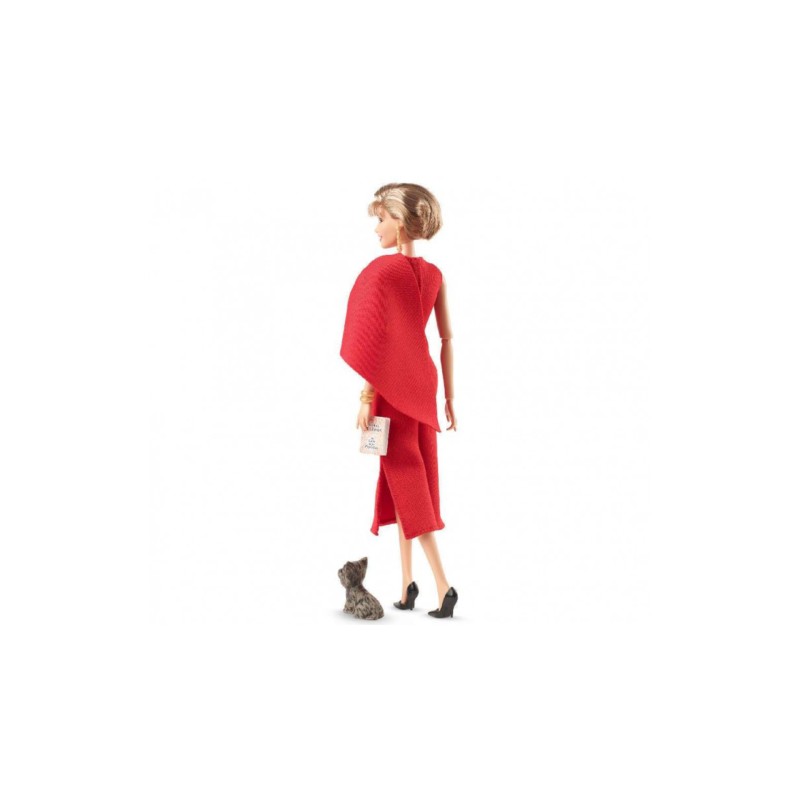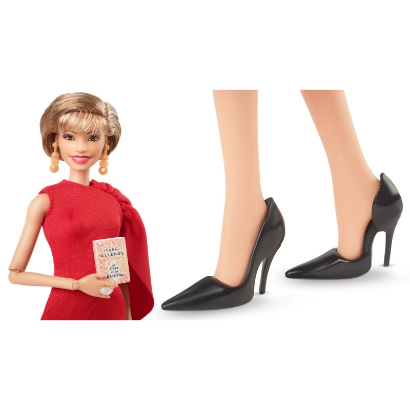 Păpușa Barbie Isabel Allende poartă o rochie roșie îndrăzneață cu o pelerină adunată care se desfășoară pe umăr. Cercei aurii, tocuri negre elegante și buze de un roșu aprins finalizează look-ul ei îndrăzneț, dar elegant.
