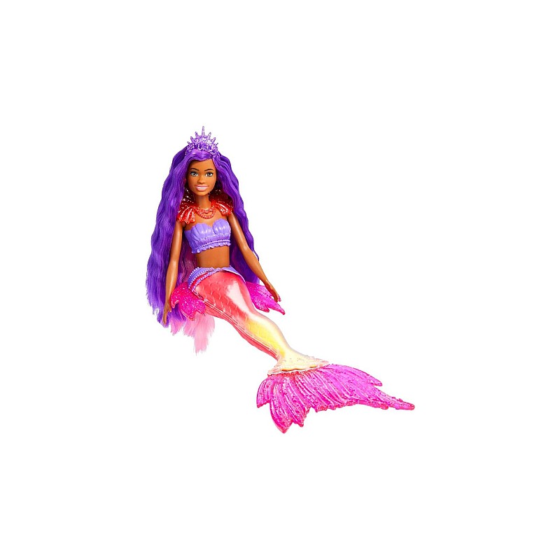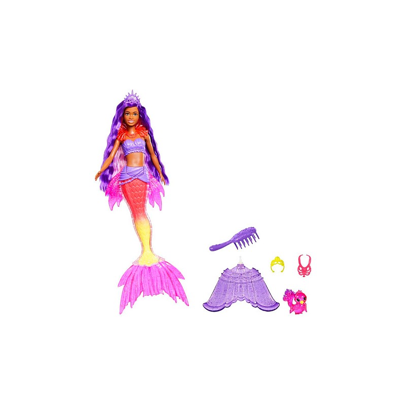 Păpușa Barbie 'Brooklyn' Roberts arată exact ca personajul ei de pe ecran după transformarea ei magnifică în sirenă, cu părul extra-lung și un look demn de regalitatea subacvatică.