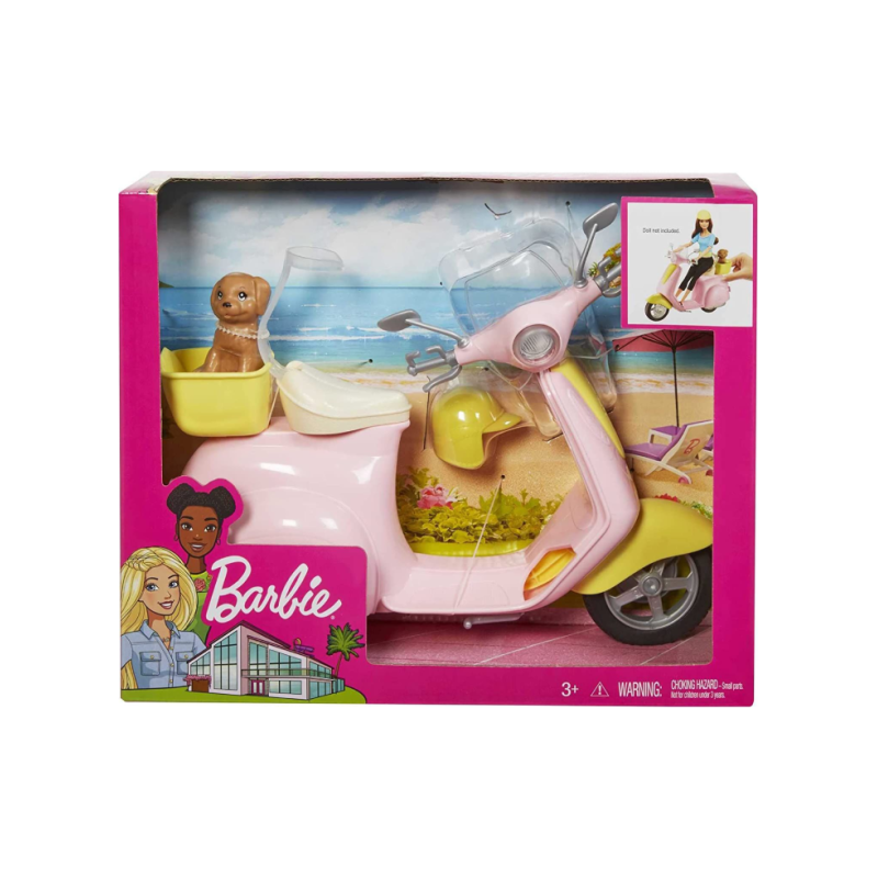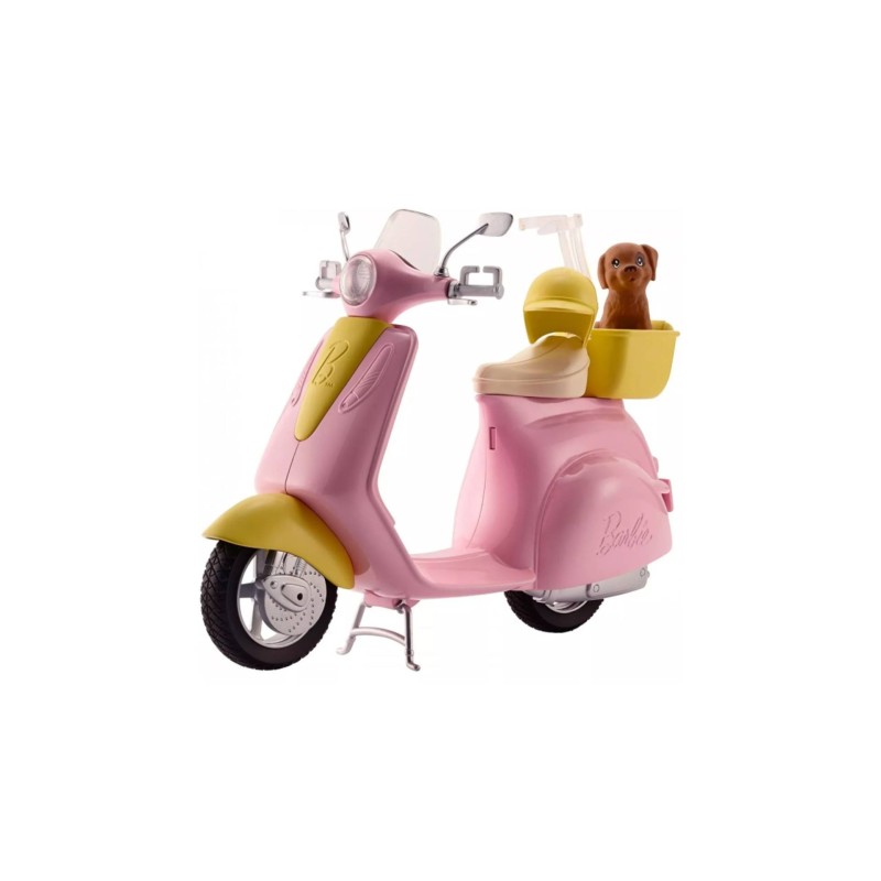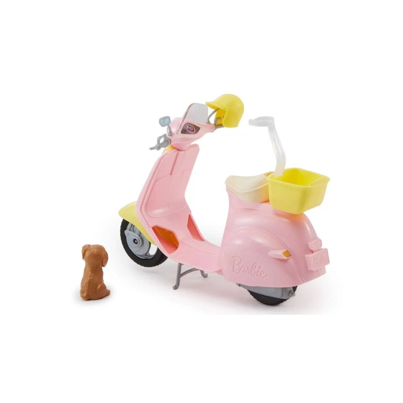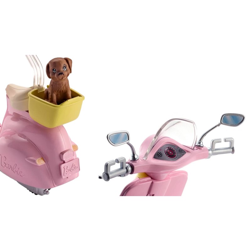 Adu cu tine cățelușul în coșulețul galben de pe spate. Iar o cască galbenă pentru păpușa Barbie îi permite să călătorească în siguranță și cu stil.