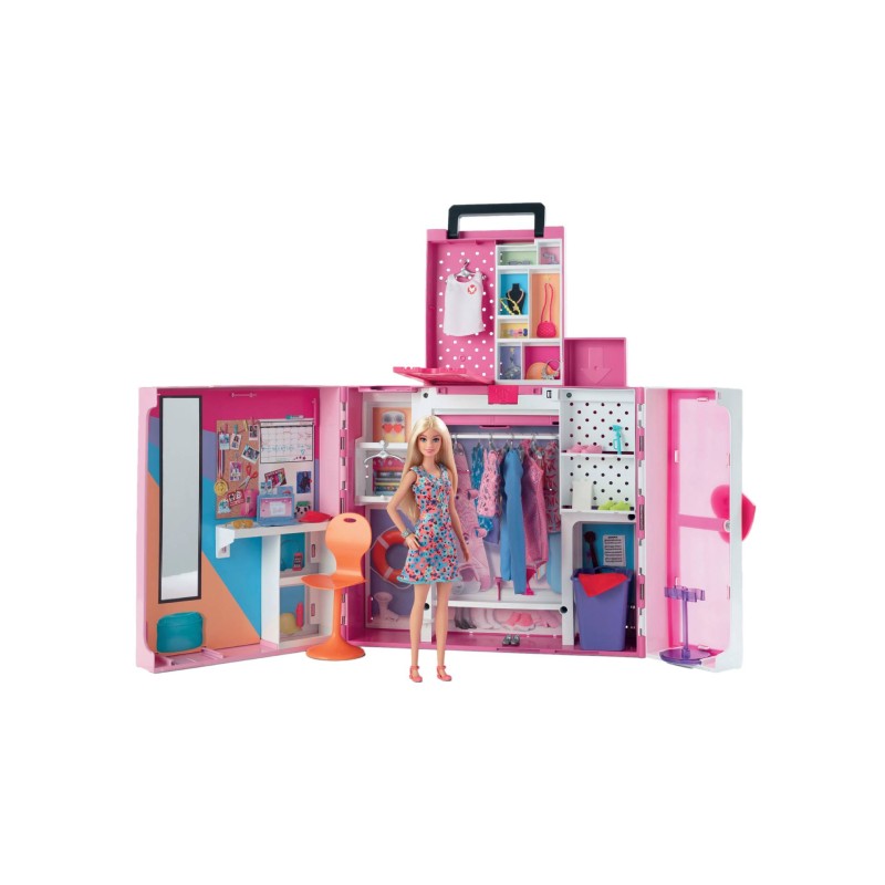 Setul nu este doar conceput pentru a fi transportat datorita manerului, ci include si papusa Barbie, plus haine si accesorii pentru a te juca si combina tinute la nesfarsit.