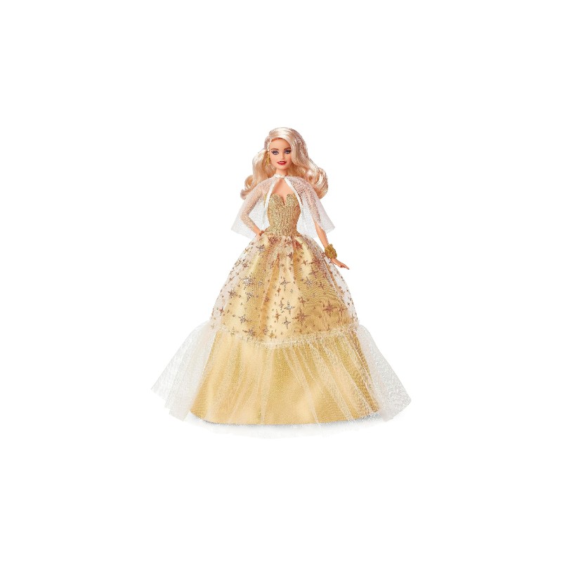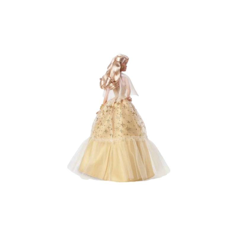 Păpușa Barbie de sărbători întruchipează spiritul sezonului într-o superbă rochie aurie care strălucește cu detalii înstelate.