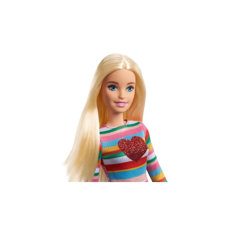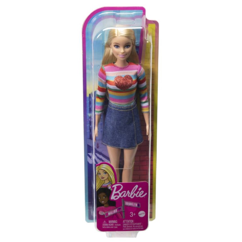In stilul ei, papusa Barbie Malibu poarta un top cu dungi curcubeu cu o inima stralucitoare si o fusta de blugi cu cusaturi galbene. Adidasii ei roz completeaza aspectul ei.