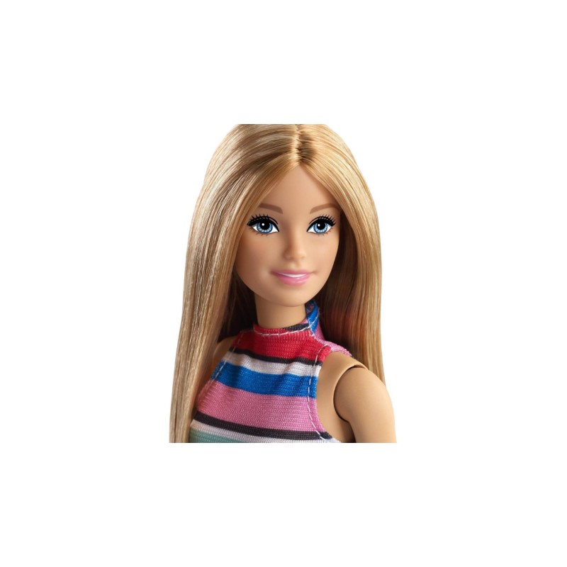 Păpușa Barbie poartă o rochie versatilă, cu un corset cu dungi colorate și o fustă din denim, asortată cu pantofi albi.