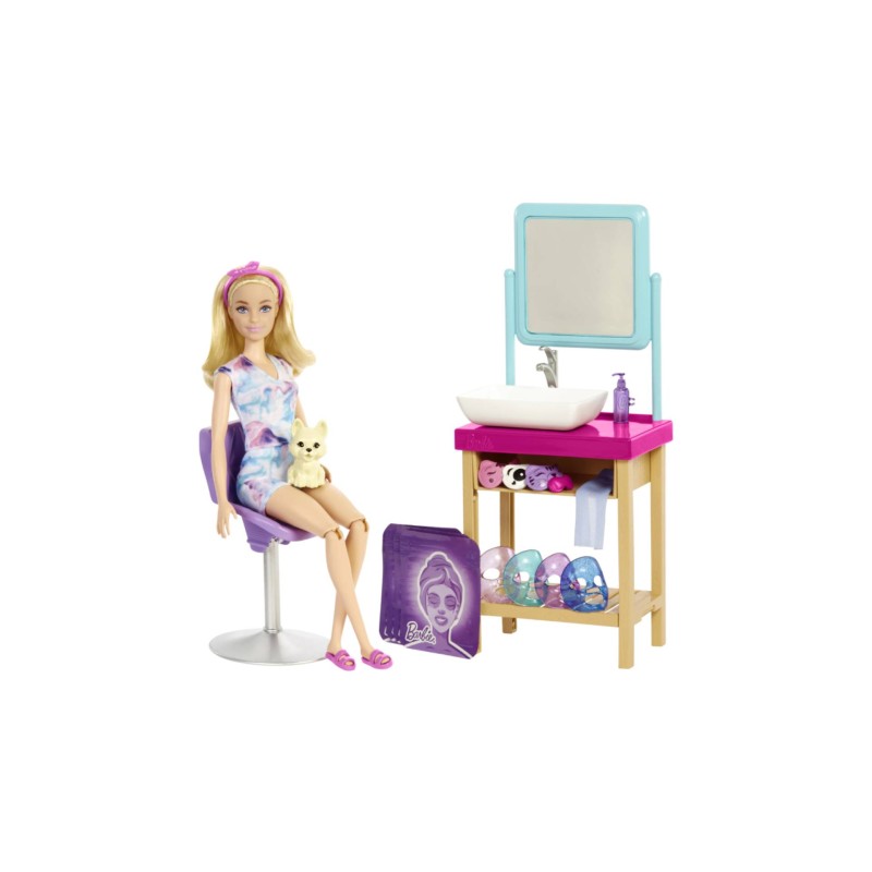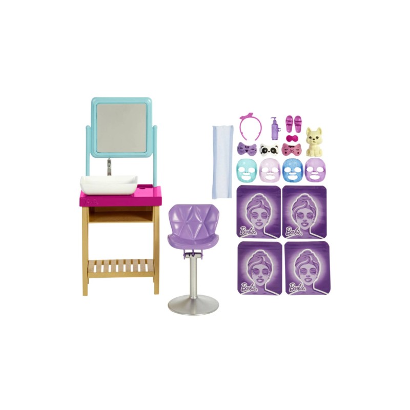Setul de joaca dispune de o papusa Barbie cu genunchi flexibili, o figurina catel cu masca de ochi, zona de toaleta, chiuveta si altele, pentru a reproduce o experienta faciala relaxanta.