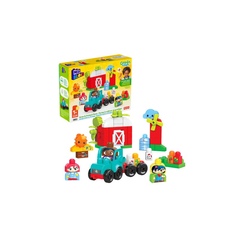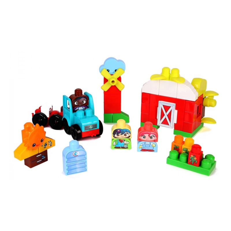 Cei mici pot construi un tractor rulant, un hambar, culturi, un stup de albine, o moară de vânt care se rotește și 3 personaje. Micuțul tău poate chiar să amestece și să asorteze cele 3 personaje construibile.