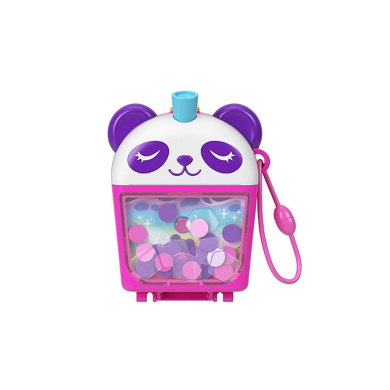 Acest set adorabil Polly Pocket Bubble Tea Panda are forma unei băuturi panda boba, cu o funcție distractivă de agitare a bilelor boba!