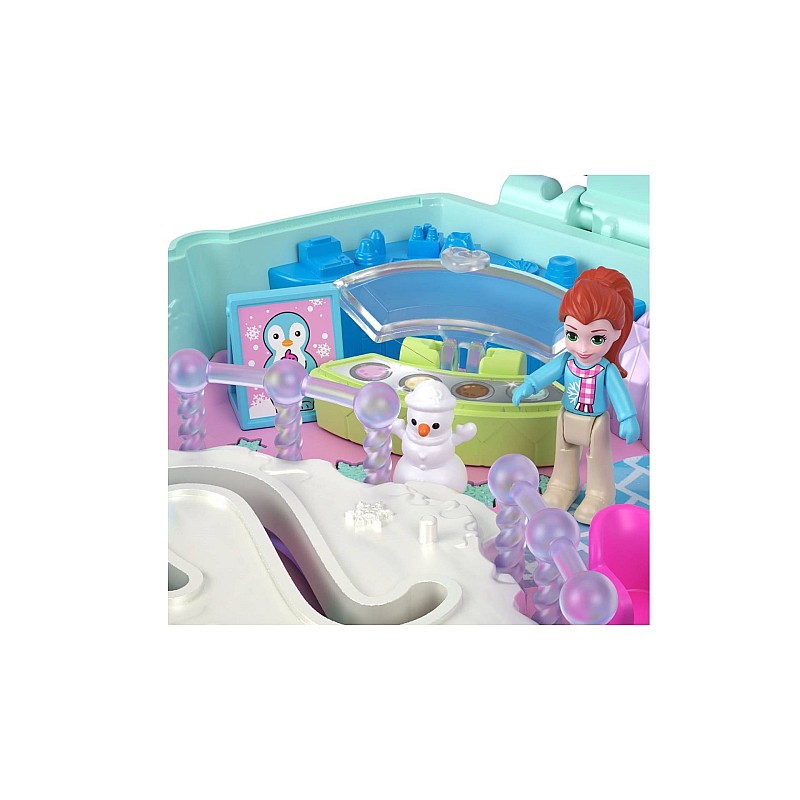 Interiorul se deschide pentru a dezvălui un set de joacă în miniatură de iarnă, plin de caracteristici interactive și accesorii care oferă ore nesfârșite de joacă imaginativă.