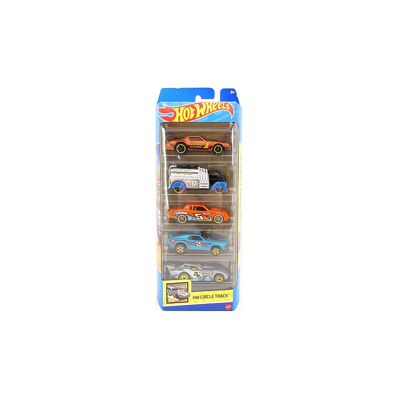 Pachetul Hot Wheels Circle Track 5-Pack include diferite mașini: Camaro Z28, Fast Gassin', Buick Grand National, Ford Mustang Mach 1'70 și Maximum Leeway.