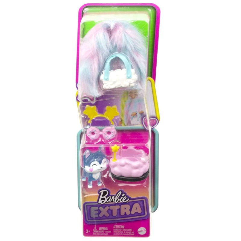 Pachetele Barbie Extra Fashion Packs prezintă un animal de companie cu un aspect jucăuș și accesorii exagerate, unele pentru animalul de companie și altele pentru păpușa Barbie.