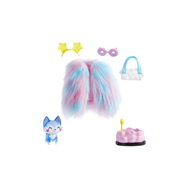 Acest pachet prezintă un cățeluș husky de companie de culoare albastru-translucid cu o expresie adorabilă și accesorii amuzante.