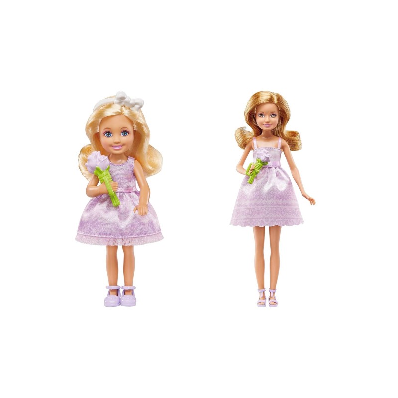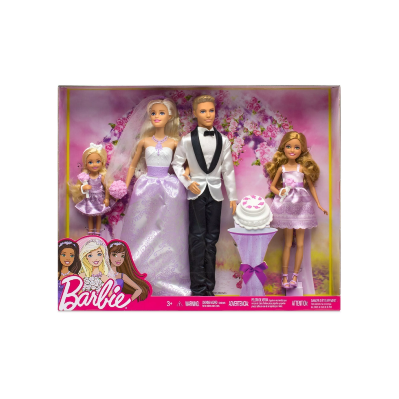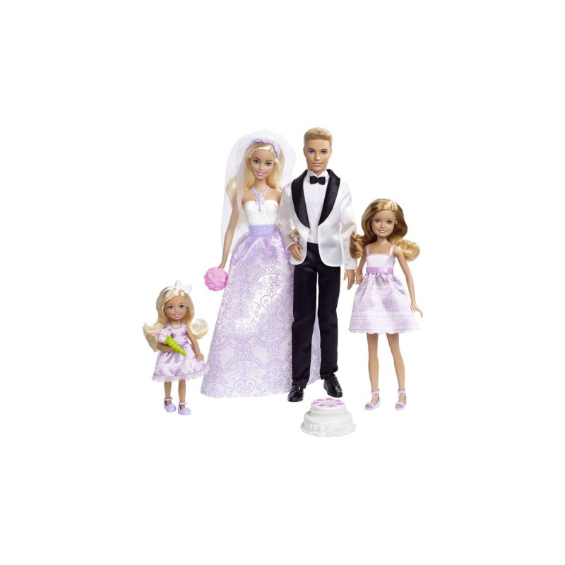 Acest frumos set cadou include o păpușă Barbie mireasă, o păpușă Ken mire, Stacie domnișoară de onoare și Chelsea domnișoară de onoare.