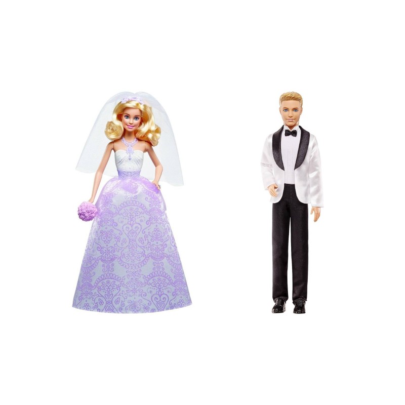 Barbie poartă o rochie de mireasă uimitoare, formată dintr-un corset fără bretele și o fustă fluidă cu imprimeu lavanda, iar păpușa Ken într-un frac clasic alb negru, cu papion și pantofi negri.