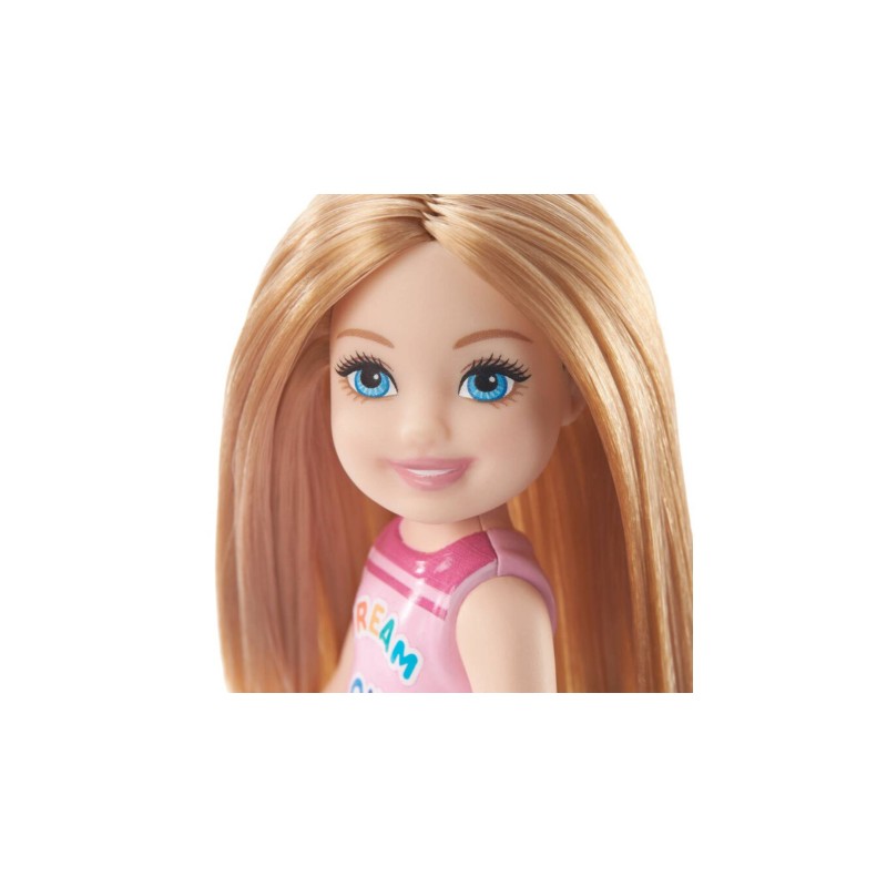 Păpușa Chelsea poartă o fustă albastră, pantofi galbeni strălucitori și un top care îi încurajează pe copii să viseze.