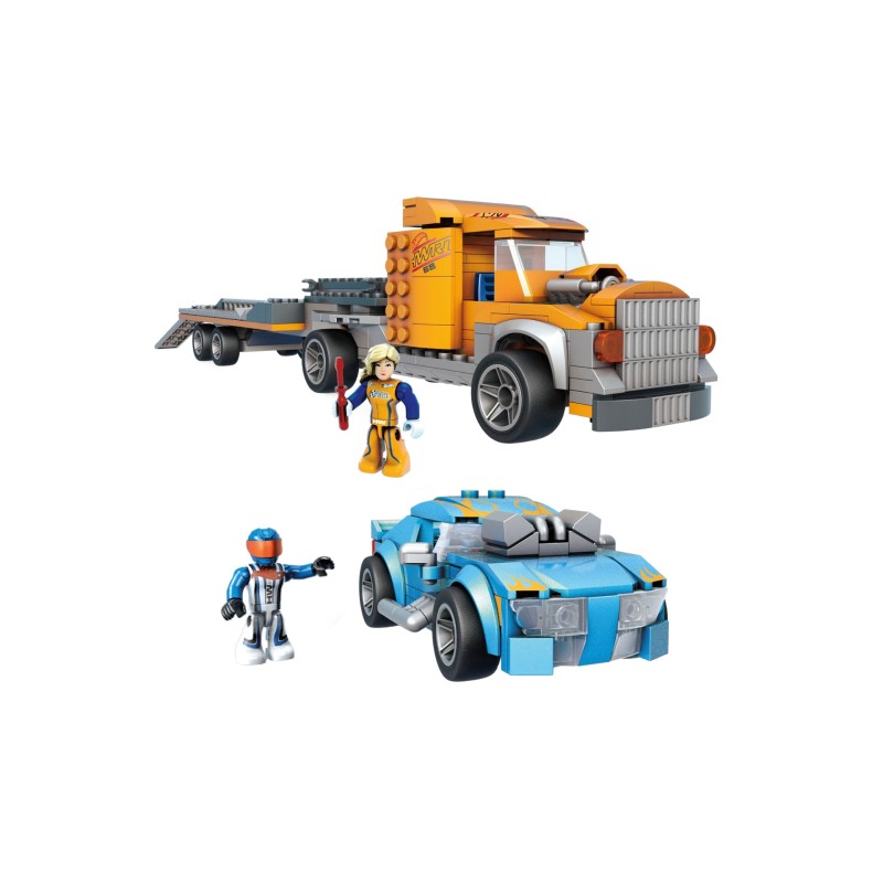 Deține pista de curse, apoi împachetează pentru un drum lung cu acest set construibil Hot Wheels Twinduction Hauler Pack.