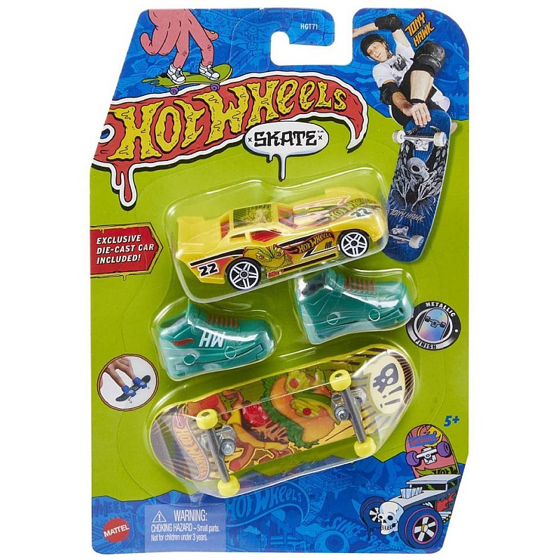Colecția a fost concepută în colaborare cu legenda skateboardingului Tony Hawk, iar fiecare set are detalii asortate, cu grafică metalică a plăcii și un vehicul exclusiv Hot Wheels.