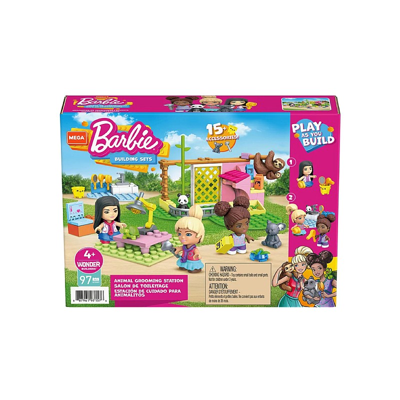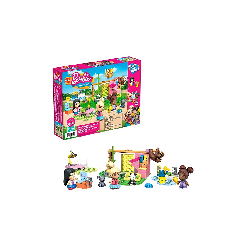 Setul de construcție include 3 micro-piloți Barbie, 5 animale, inclusiv un panda, o broască țestoasă, un koala, un leneș și un pui de leneș, 97 de cărămizi de construcție cu piese și accesorii speciale și 3 plăci de bază în formă de inimă.