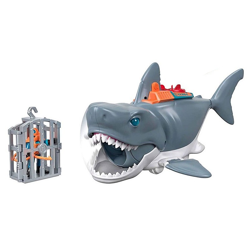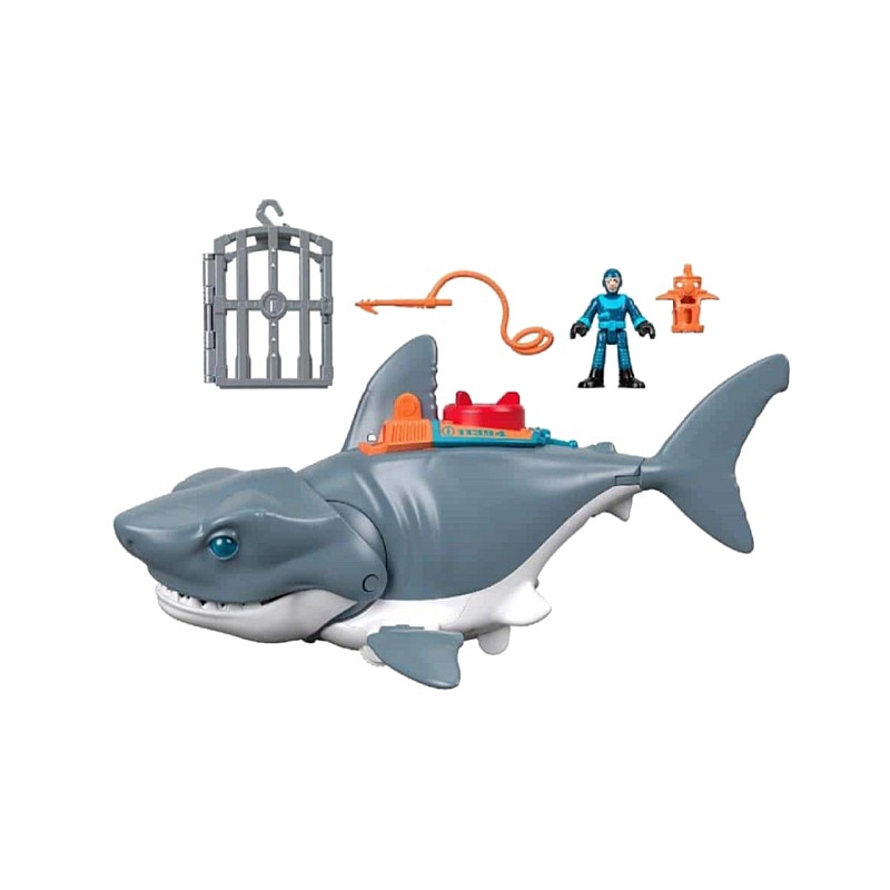 Pachetul include: un rechin mare de jucărie cu figurină de scafandru, o cușcă și accesorii.