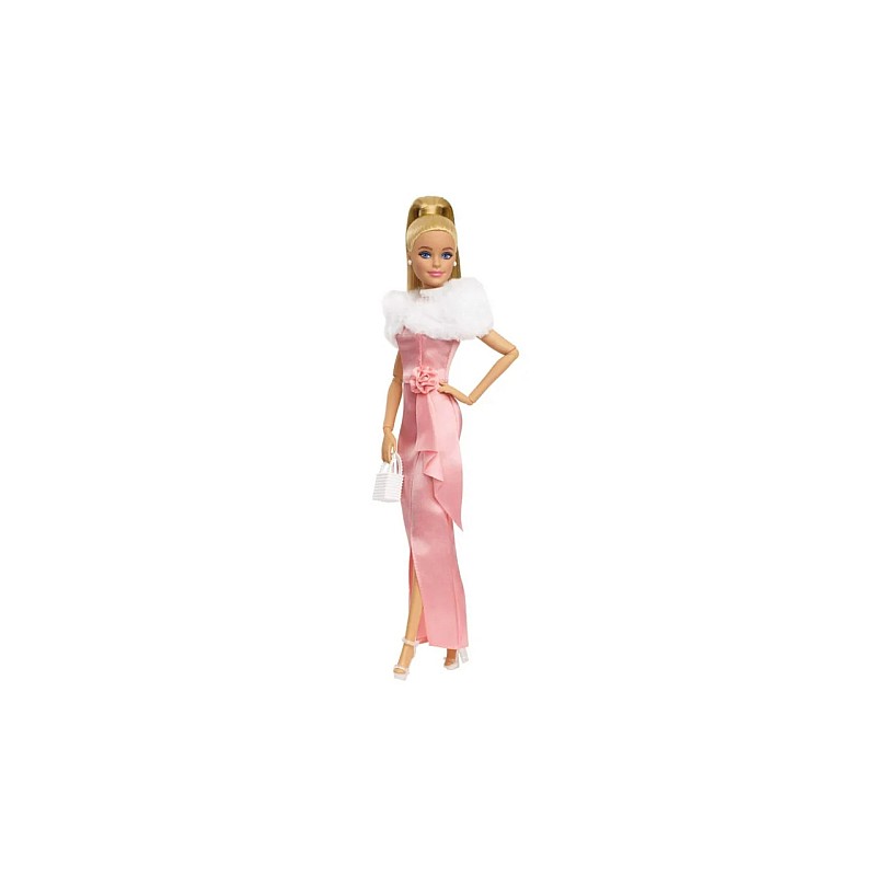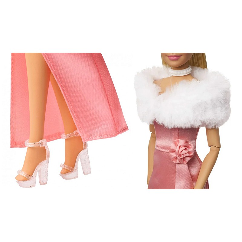 Părul acestei păpuși Barbie articulate este prins într-un coc care îi accentuează cerceii albi și colierul asortat. O geantă cu mărgele și tocuri delicate cu barete îi completează ansamblul.