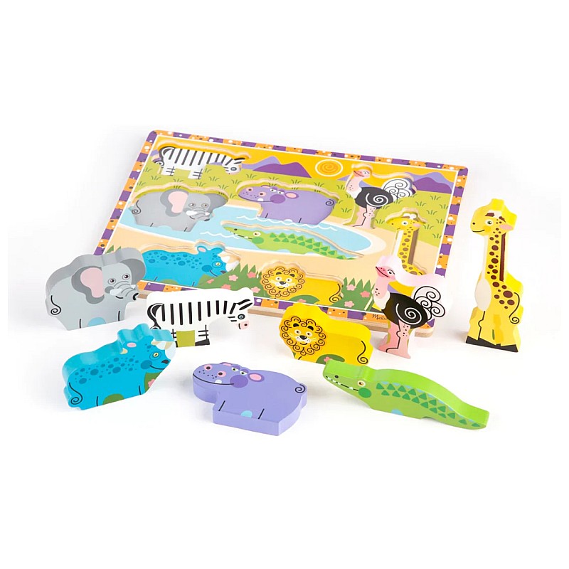 Animalele africane preferate de cei mici sunt prezentate pe acest puzzle din lemn foarte gros.